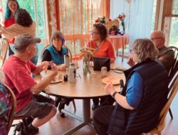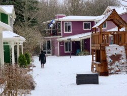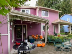 Our 3400 square foot Common House is the hub of all activities at Cascadia. We have a large living room with a gas fireplace which is a comfortable place to socialize. Next to this, is a large dining room which can seat 60 where we have meals, events, and monthly meetings. We have a commercial grade kitchen for cooking food for common meals, parties, and social occasions. There is a small kids playroom attached to the dining room where the young ones often hang out. Behind the dining room is the recreation/media room where we watch movies and occasionally have pillow fights. There are also 2 bathrooms, a laundry room, and mudroom/mailroom on the first floor. Upstairs we have a wonderful Aerie where we have regular yoga classes and meditation, 2 guest rooms, an office, bathroom and library with gas fireplace. On the backside of the common house we have a patio facing the wetlands with a gas grill. the other side of common house has a garden and hosts our honey bee friends.